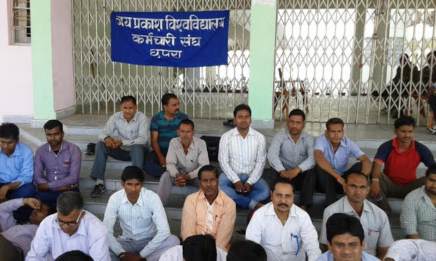जय प्रकाश विश्वविद्यालय कर्मचारी संघ के 11 सूत्री मांगो के विरूद्ध मंगलवार को भी धरना जारी रहा। धनार्थियों ने विश्वविद्यालय प्रशासन से सकारात्मक पहल करने हेतु अपने दो वरीय, दो कर्मियों सुदर्शन प्रसाद यादव, प्रशासन पदाधिकारी (स्थापना) एवं राजेश्वर सिंह, वरीय लेखापाल सह पूर्व सचिव, जय प्रकाश विश्वविद्यालय कर्मचारी संघ को कुलपति के आवासीय कार्यलय पर भेजा जिसमें दोनों कर्मियों ने आंदोलनकारियों के उचित मांगों को दशार्ते हुए उनका पक्ष कुलपति के समक्ष रखा जिसके बावजूद भी कोई ठोस परिणाम नहीं निकल सका। यहीं नहीं धरनास्थल पर पहुंचे जिला प्रशासन प्रतिनिधि के रूप में सदर के प्रखंड विकास पदाधिकारी ने भी कर्मचारियोें की मांगों को विवि के कुलसचिव के समक्ष दूरभाष के माध्यम से रखकर हड़ताल को समाप्त कराने का आग्रह किया। जिस पर कुलसचिव ने प्रखंड विकास पदाधिकारी को बताया कि आप कुलपति आवास आए और कर्मचारियों से संबंधित कुछ जानकारी प्राप्त करें। क्योंकि इस आवास पर सभी पदाधिकारी कुलपति के साथ मौजूद है। इसके बाद भी आंदोलन समाप्त कराने की दिशा में विवि प्रशासन द्वारा कोई पहल नहीं किया गया और न ही कोई पदाधिकारी धरना स्थल पर उपस्थित हो रहे है। ऐसी परिस्थिति में कर्मचारी अपने आंदोलन को जारी रखे हुए है। धरना के नेतृत्व अध्यक्ष राजेश कुमार पाण्डेय तथा सचिव रवीन्द्र प्रसाद यादव ने किया। धरनार्थियों को संबोधित करते हुए अध्यक्ष श्री पाण्डेय ने अबतक के आन्दोलन को सविस्तार से प्रकाश डाला, जबकि सचिव श्री यादव ने कहा कि कोई भी पदाधिकारी विश्वविद्यालय में वार्ता के लिए नहीं आ रहे हैं। जिसके कारण न तो कर्मचारियों की समस्याओं का समाधान हो रहा है और न हीं आन्दोलन को समाप्त कराने के लिए विश्वविद्यालय प्रशासन कोई सकारात्मक भूमिका निभा रही है। जबकि कर्मचारियों ने अपनी जायज मांगों को समझौता के तहत कुलपति के समक्ष अवगत करा दिया है। हालांकि अपनी मांगों को लेकर सभी कर्मचारी एकजुटता के साथ धारना पर बैठे रहे। धरना पर बैठने वालोें में समरजीत कुमार सिन्हा, कुदरत अली, आलोक कुमार, आदर्श कुमार, अखिलेश्वर त्रिपाठी, प्रमोद कुमार, देव नारायण राय, कुणाल किशोर, प्रकाश रंजन कुमार, संजय कुमार, विवेक कुमार, विपिन कुमार, श्याम किशोर राय, मंटू शर्मा, मधुकर मधूप, अमित कुमार, अखिलेश कुमार आदि उपस्थित थे।