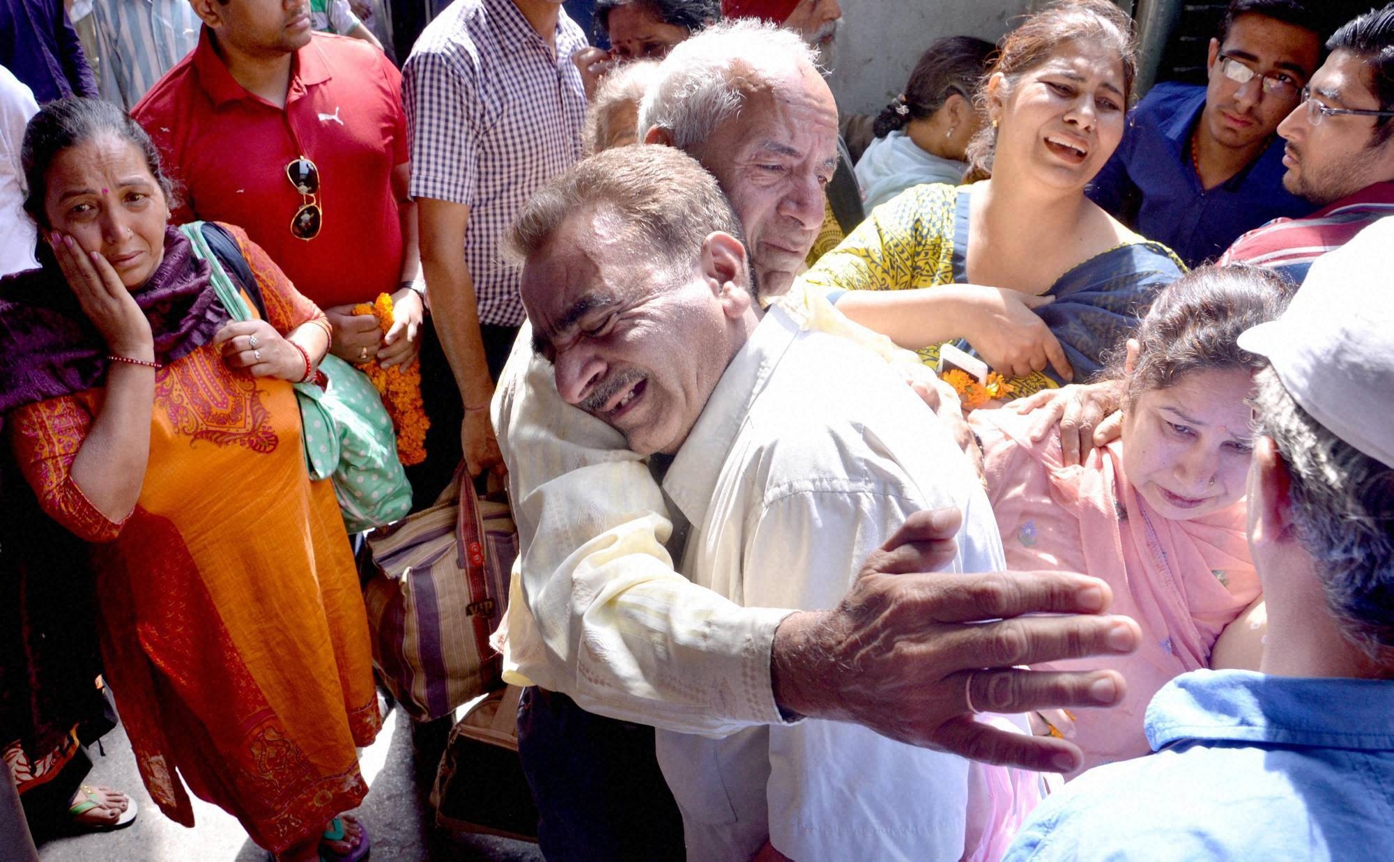 Amritsar: Indian earthquake survivors greet their relatives after being rescued by the Indian Airforce from Nepal at Amritsar airport on Monday. PTI Photo(PTI4_27_2015_000049B)