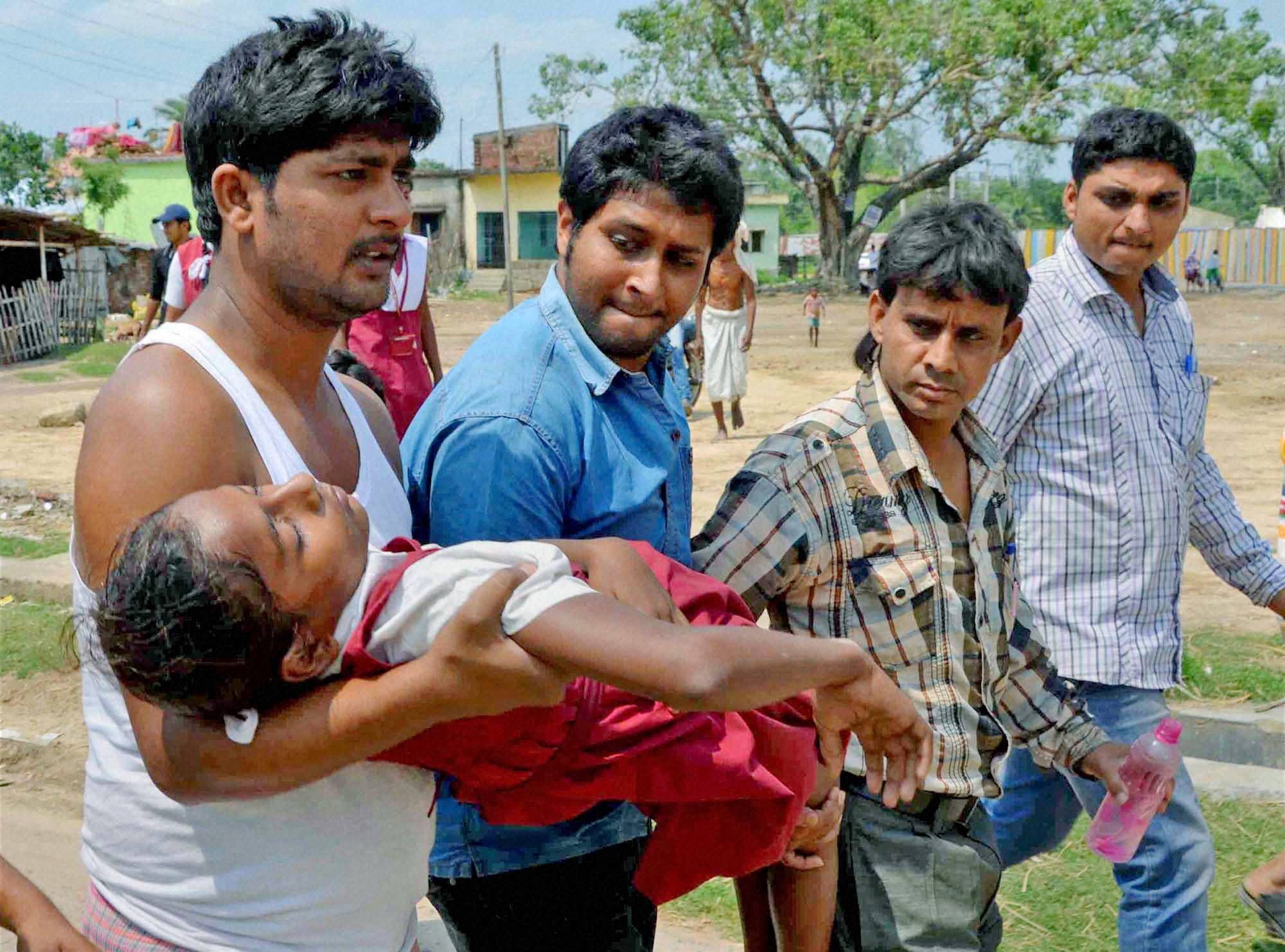 Malda: People carry a school girl toa hospital as she fainted after an earthquake in Malda district in West Bengal on Saturday. PTI Photo (PTI4_25_2015_000077B)