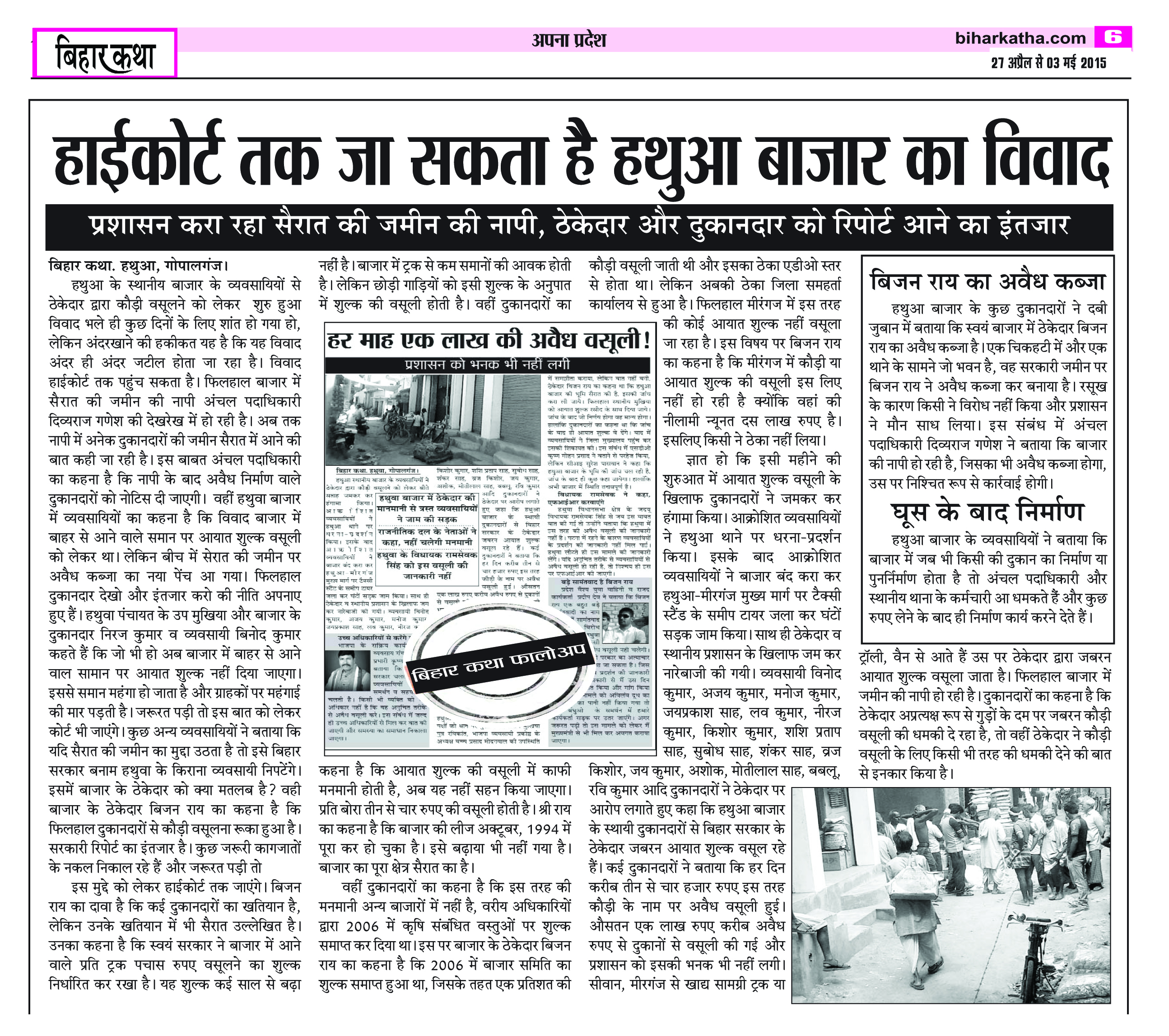 हथुआ के स्थानीय बाजार के व्यवसायियों से ठेकेदार द्वारा कौड़ी वसूलने को लेकर शुरु हुआ विवाद भले ही कुछ दिनों के लिए शांत हो गया हो, लेकिन अंदरखाने की हकीकत यह है कि यह विवाद अंदर ही अंदर जटील होता जा रहा है। विवाद हाईकोर्ट तक पहुंच सकता है। फिलहाल बाजार में सैरात की जमीन की नापी अंचल पदाधिकारी दिव्यराज गणेश की देखरेख में हो रही है। अब तक नापी में अनेक दुकानदारों की जमीन सैरात में आने की बात कही जा रही है। इस बाबत अंचल पदाधिकारी का कहना है कि नापी के बाद अवैध निर्माण वाले दुकानदारों को नोटिस दी जाएगी। वहीं हथुवा बाजार में व्यवसायियों का कहना है कि विवाद बाजार में बाहर से आने वाले समान पर आयात शुल्क वसूली को लेकर था। लेकिन बीच में सेरात की जमीन पर अवैध कब्जा का नया पेंच आ गया। फिलहाल दुकानदार देखो और इंतजार करो की नीति अपनाए हुए हैं। हथुवा पंचायत के उप मुखिया और बाजार के दुकानदार निरज कुमार व व्यवसायी बिनोद कुमार कहते हैं कि जो भी हो अब बाजार में बाहर से आने वाल सामान पर आयात शुल्क नहीं दिया जाएगा। इससे समान महंगा हो जाता है और ग्राहकों पर महंगाई की मार पड़ती है। जरूरत पड़ी तो इस बात को लेकर कोर्ट भी जाएंगे। कुछ अन्य व्यवसायियों ने बताया कि यदि सैरात की जमीन का मुद्दा उठता है तो इसे बिहार सरकार बनाम हथुवा के किराना व्यवसायी निपटेंगे। इसमें बाजार के ठेकेदार को क्या मतलब है? वही बाजार के ठेकेदार बिजन राय का कहना है कि फिलहाल दुकानदारों से कौड़ी वसूलना रूका हुआ है। सरकारी रिपोर्ट का इंतजार है। कुछ जरूरी कागजातों के नकल निकाल रहे हैं और जरूरत पड़ी तो